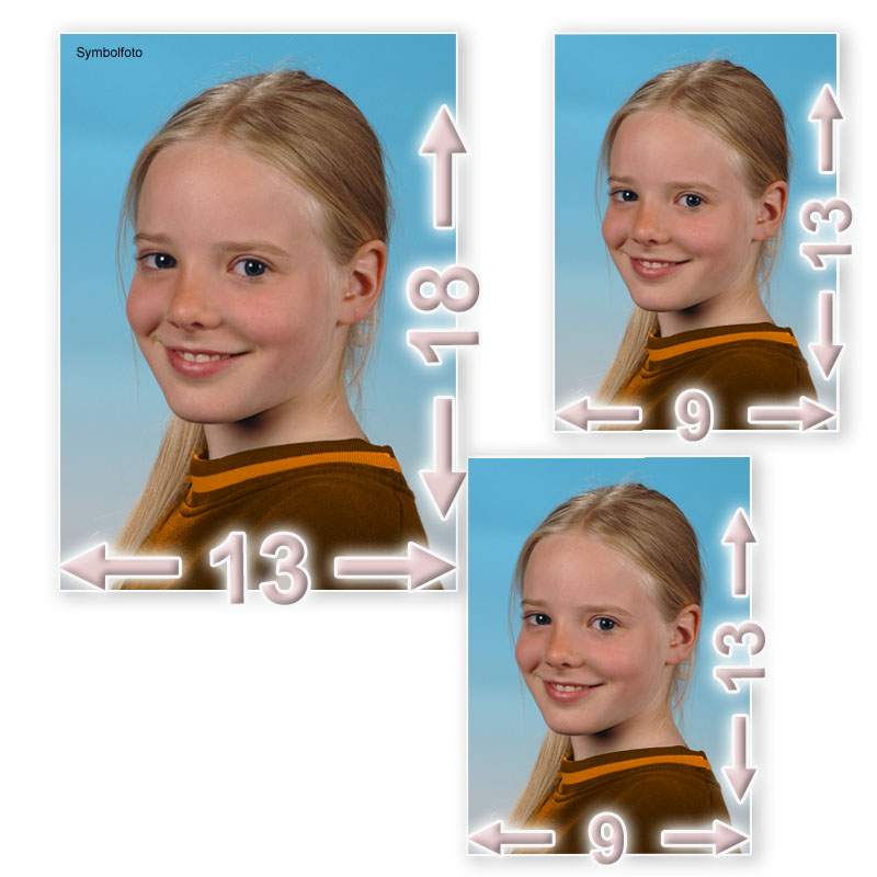 Ein Portrait 13/18 und zwei Portrait 9/13 in Farbe (alle Angaben sind ca.-Angaben. Die tatsächliche Papiergröße berechnet sich aus der Maßeinheit 'Inch' ) 13/18 = 5Inch / 7Inch 9/13 = 5Inch / 3.5Inch
